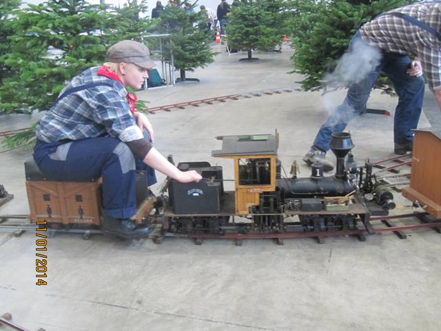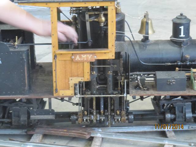 Une Shay, reproduction d’une locomotive Américaine utilisée dans les exploitations forestières et dont la disposition des essieux entrainés par cardans permettait de rouler sur tous type de voie, même très irrégulières, faisait des manœuvres avec une très grande souplesse. Son moteur vertical à vapeur à deux cylindres à simple expansion assurait l’entrainement de la transmission et la rotation des roues grâce à un couple d’engrenages coniques sur chaque essieu. Une très belle mécanique !