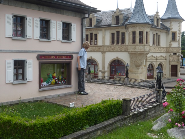 le réel et la miniature. La montagne en arrière-plan est vraie, mais l’étable