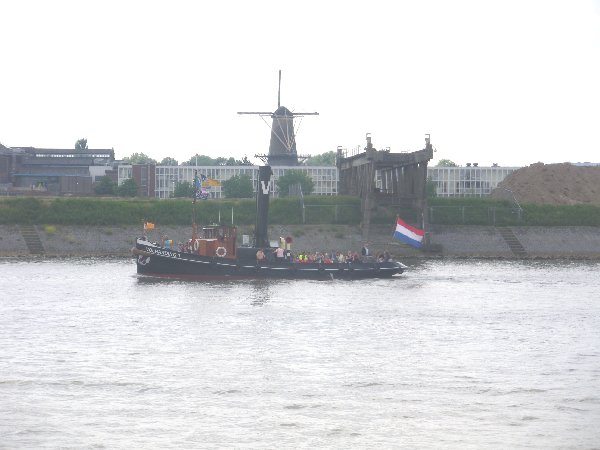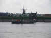 image de la Hollande avec un moulin à vent et un remorqueur. |