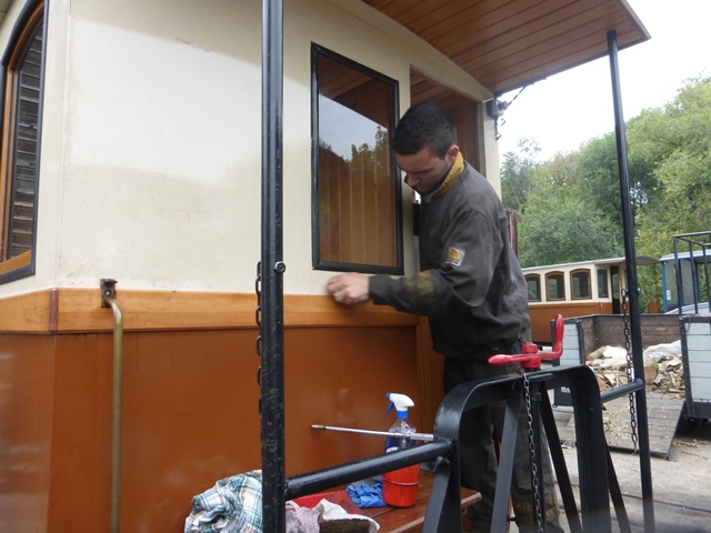 Sous la direction de notre responsable vapeur adjoint Michel, notre bonne vieille TABAMAR monte doucement en pression tandis que Hundy nettoie la voiture fermée à 2 essieux qui constituera le train.