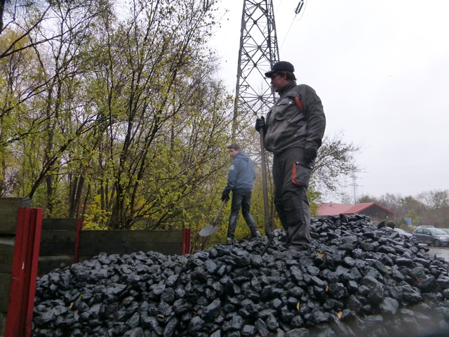 commençant à la pelle le transfert des 20 tonnes de charbon dans le parc à