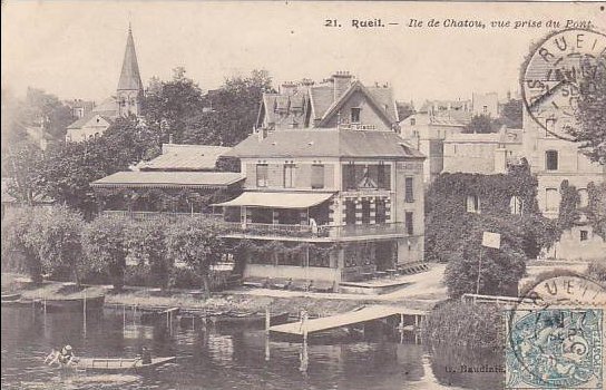 La Hameau Fournaise sur l'Île des Impressionnistes à Chatou est lié au développement du canotage dans cette deuxième moitié du XIXème S. En 1857, Alphonse Fournaise, charpentier naval de son état, s'y installe pour y ouvrir un petit hôtel avec restaurant et une location de bateaux pour y accueillir les Parisiens qui le dimanche viennent en train à vapeur passer une journée de repos et de plaisir au bord de l'eau. L'île devient vite le lieu de rencontre des artistes et des poètes et en cette fin fin XIXè, Auguste Renoir, Claude Monet, Alfred Sisley, Guy de Maupassant y viennent régulièrement inspirés par le charme de cette nature si près de la turbulente capitale. Des passionnés de canotage y partagent également des moments d'insouciance au bord de l'eau. C'est l'époque des premiers trains, des guinguettes et des joutes nautiques. Si le train dessert Chatou dès octobre 1837, c'est à dire quelques mois seulement après l'ouverture de la ligne historique de Paris à St Germain ou plutôt au Pecq (terminus de la ligne), il est dès 1891 concurrencé par de nouveaux projets de tramways qui veulent s'aventurer sur la traversée de la Seine par le vieux pont juste entre la Maison Fournaise et l'actuelle "Rives de la Courtilles". Et enfin, des rails ont été posés là tout près de ces vénérables édifices, l'un avec un pied dans le XIXè, l'autre construit à la fin du XXè pour re-dynamiser le site et c'est réussi !