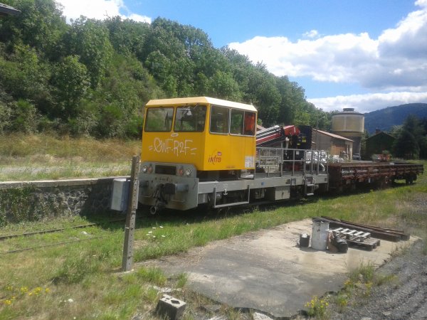 gare d'Alleyras, une draisine et un plat à bogies sur une voie de garage, sans doute pour les travaux