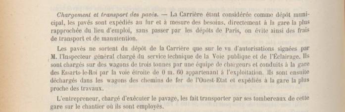 D’après le rapport du Conseil municipal de Paris de 1908, le transport des pavés se déroulait comme suit :
