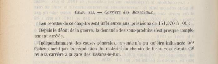 L’exploitation de la carrière continua pendant la Première Guerre Mondiale avec le personnel non mobilisé. Le hameau des Maréchaux devint provisoirement le lieu de stockage des pavés.