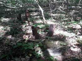 Nous continuons à suivre le tracé de la voie de 60 en contournant l’ancienne carrière par le sud. 12 tronçons de rail Decauville (9,5 kg au mètre) sont plantés dans le sol formant de solides piquets pour une éventuelle clôture. Des pavés sont également visibles le long du chemin.