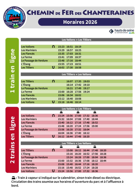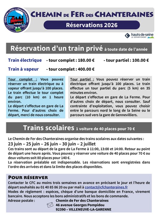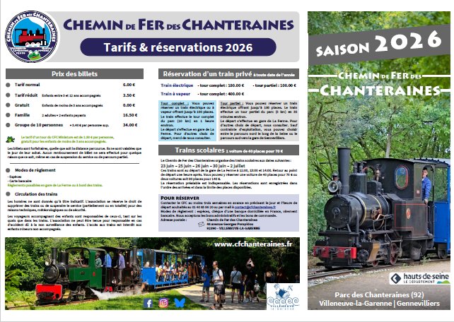 Le Chemin de fer des Chanteraines se situe sur les communes de Villeneuve-la-Garenne et de Gennevilliers à 6 Km au Nord-Ouest de Paris. C'est un parc de 80 hectares ouvert au public toute l'année, parc de détente et de promenade. S'étendant du Pont d'Épinay jusqu'au RER C, gare de Gennevilliers, il comprend différents centres d'attraction : ferme d'enfants, poney-club, cirque, guignol, étang de pêche, réserve naturelle, et un lac pour des activités nautiques, de pêche et une fosse de plongée. Le trait d'union de ces différents pôles est réalisé grâce à une ligne de chemin de fer dit "Decauville" à voie de 60 qui serpente sur 5 km du Pont d'Épinay, jusqu'à la gare RER C de Gennevilliers. Ce chemin de fer est géré par une association type loi de 1901 sous tutelle du Conseil Général des Hauts-de-Seine. |
