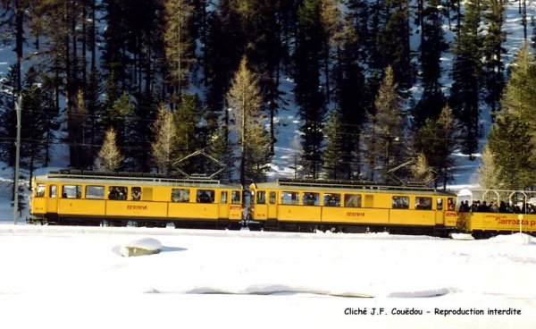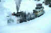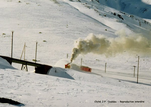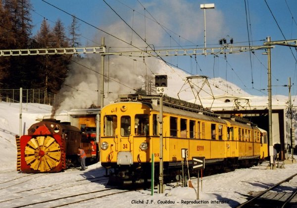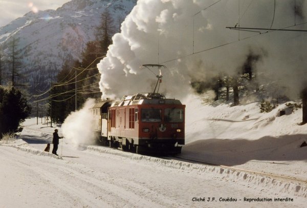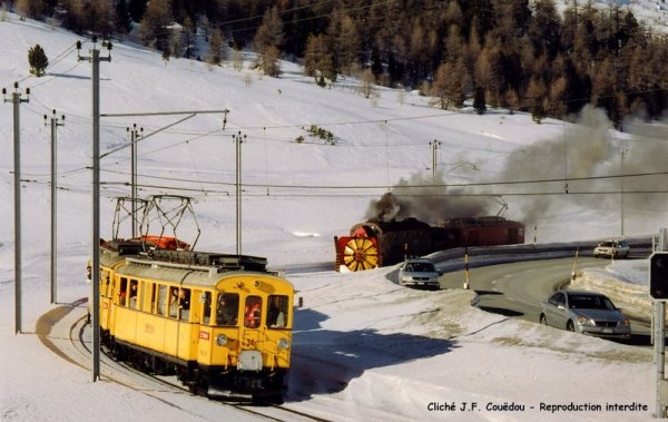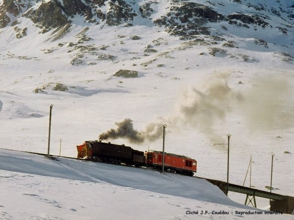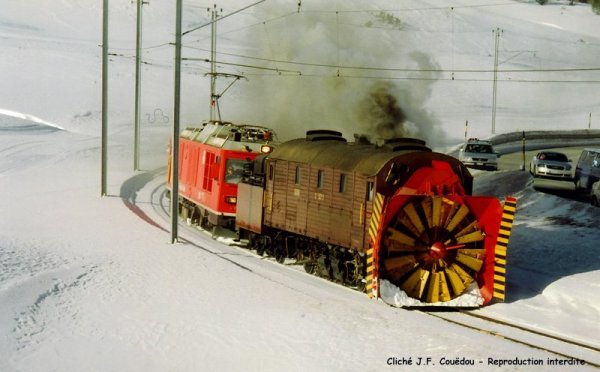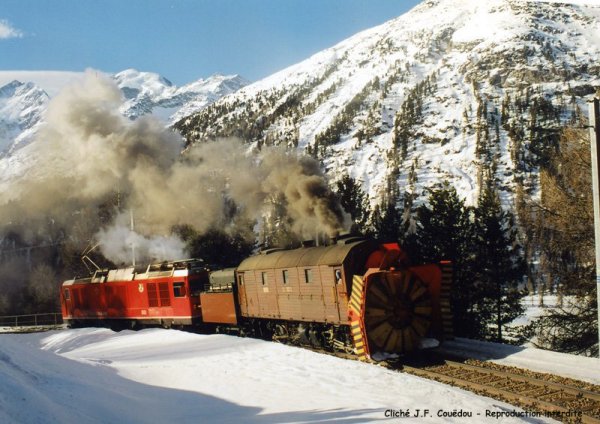 Chasse neige à vapeur des chemins de fer Rhétique sur la ligne de la Bernina le 14/02/2004 Trajet Pontresina - Alp Grün. Le nom du chasse neige est X rot 9213. Il est encore en service, et une sortie amateur est organisée certaines années. Les amateurs ont la possibilité de précéder l'engin depuis un train remorquant un wagon ouvert. Le chasse neige ne dispose que d'une mobilité réduite sa chaudière de taille modeste devant alimenter 5 cylindres. En ligne il est maintenant toujours assisté d'une "ambi machine" (diesel + électrique). Par mesure de sécurité le courant de la caténaire est coupé quand le chasse neige est en action. La machine fonctionne alors avec son moteur diesel (voir les photos). Il ne reste que 2 chasse neige à vapeur à turbine en état au monde, c'est le seul en Europe, sa construction remonte à 1910. Un autre identique est conservé par le Blonay Chamby. Le second en état de marche est sur le Cumbres & Toltec Railroad Nouveau Mexique USA.