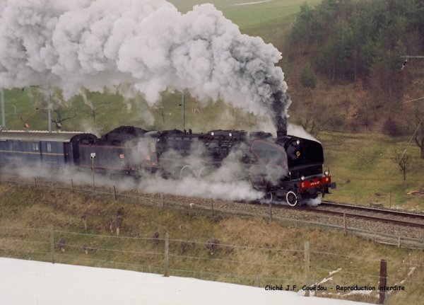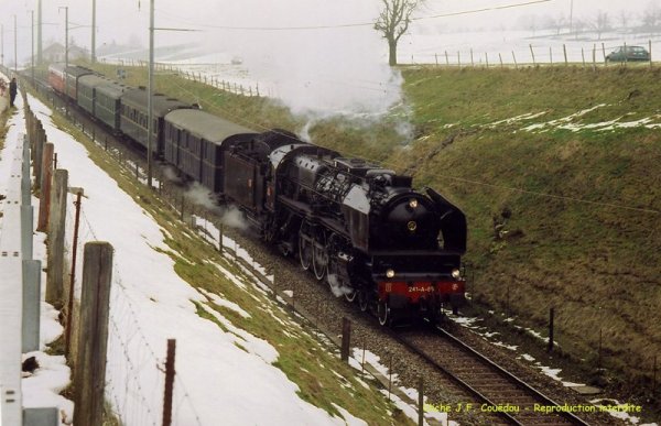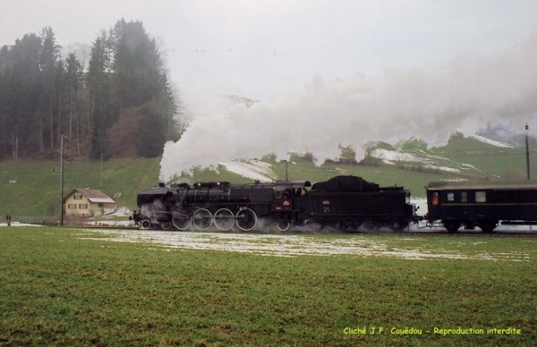 241 A 65 sur la ligne Burgdorf Konolfigen de l'EBT, trajet surprise l'après midi avec arrêts et passages pour photographes 15/02/2004. La ligne de l'EBT comporte de forte rampes 30 %o, ce qui a nécessité le fonctionnement de la machine en simple expansion. Les photos trahissent des fuites aux cylindres, mais la machine a respecté les horaires.
