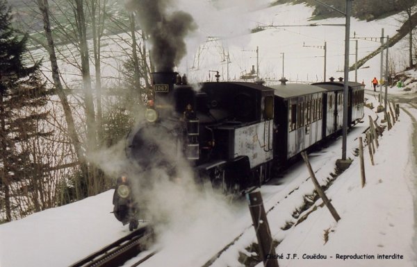 Trajet Interlaken Meringen Giswil avec la 030 T 1067 du Dampf Ballenberg Bahn sur la ligne CFF du Brünig 15/02/2004. Rappelons que cette machine avait été donnée par les CFF à la condition expresse qu'elle ne circule jamais sur la section du col à crémaillère. 4 à 5 sorties sont organisées en été, c'est la première sortie hivernale.