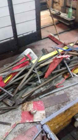Alain B. a pris la direction d'une équipe pour réorganiser l'outillage du wagon plat W1 du train de travaux : avec Jean-Pierre, il confectionne un râtelier à outils pour rendre plus accessibles les pelles, fourches et pioches qui étaient empilées et souvent bien emmêlées...