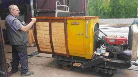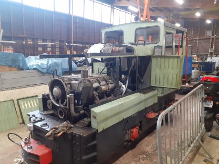 Utilisé intensivement depuis le début de la saison en raison des nombreux trains ajoutés en exploitation mais aussi en raison de sa capacité à tracter 4 voitures en même temps, le Plymouth Vert a décidé de faire des siennes le dimanche 9 mai en fin de journée. L'embrayage refuse de fonctionner. Une équipe formée par Louis P., Julien C. et Jacques H. s'est penchée sur son cas et après quelques tentatives de réglage de la pédale, la décision est prise de tomber le moteur pour pouvoir extraire l'embrayage et analyser ce que ne va pas. L'habillage du compartiment moteur est donc démonté et le moteur est déconnecté électriquement et mécaniquement de l'engin. Il ne reste plus qu'à le lever pour la prochaine séance.