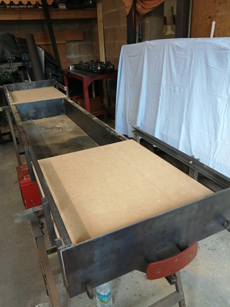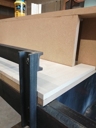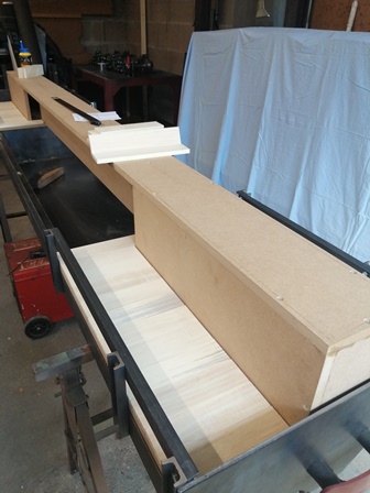 Le banc des passagers est assemblé en médium de 16 mm. collé et vissé. Après peinture, il recevra les lisses en chêne formant l’assise.