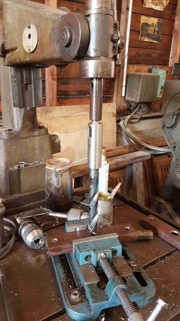 Seconde étape du façonnage des étriers : le perçage sur la perceuse à colonne,
