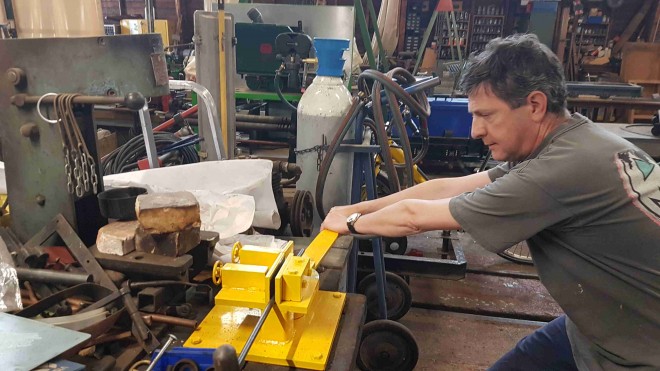 Inaugurant la plieuse réalisée par Lemziti, Thibaut confectionne des poignées en fer rond pour les chariots de la poutre de relevage.