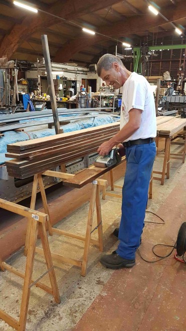Et à l'atelier bois, Pascal continue la préparation des boiseries de la V1.