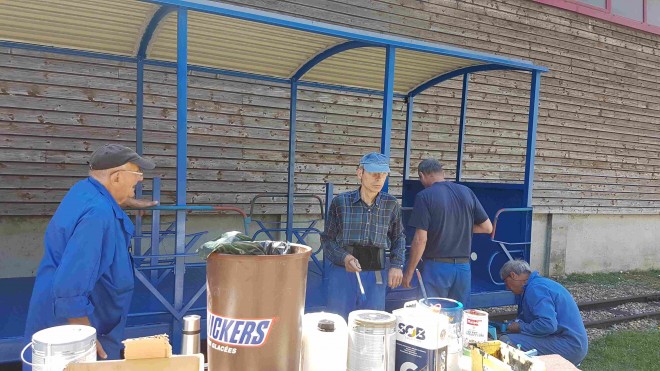 Profitant de la relative fraîcheur matinale et de l'ombre de la voie 1 encore abritée par l'atelier, l'équipe peinture s'affaire sur la baladeuse