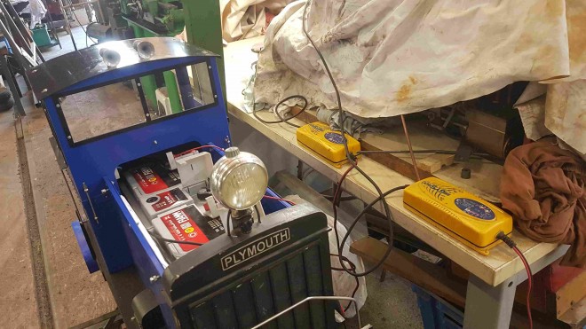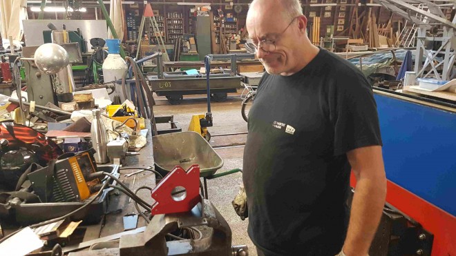 À l'intérieur, beaucoup d'activité autour du projet de locotracteur 7"1/4 de Jean-Claude qui s'affaire ici à la fabrication du support moteur de traction...