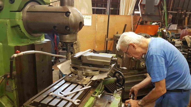 ... pendant que Michel, qui a retrouvé la fraiseuse Gambin enfin réparée, est à l'usinage des bielles de ce locotracteur...