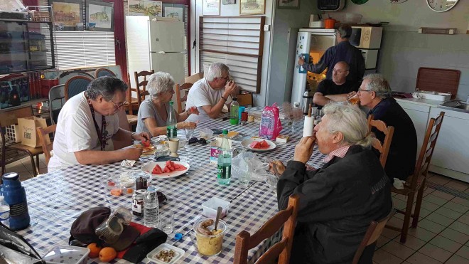 À la pause méridienne, l'ambiance est plutôt calme, la chaleur commence à peser sur tous et doit avoir fait fondre quelque peu les blagues dans le sac à malices de Jean-Claude... on ne l'entend quasiment pas !