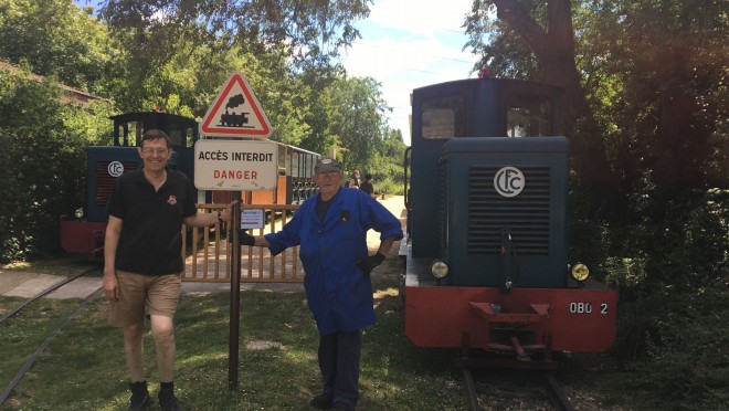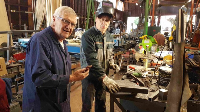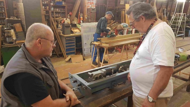 Jean-Claude présente au président Didier le support moteur de son locotracteur...
