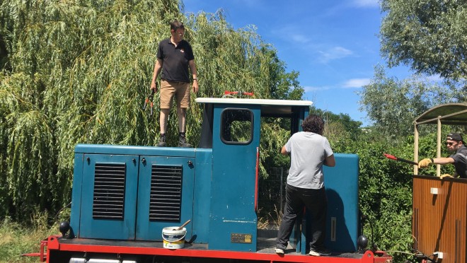 ... c'est tout simplement l'équipe de la voie, partie faire de l’élagage en urgence. Avec la chaleur, la végétation pousse si vite que si on n'y prend pas garde, les trains ne pourront bientôt plus passer.