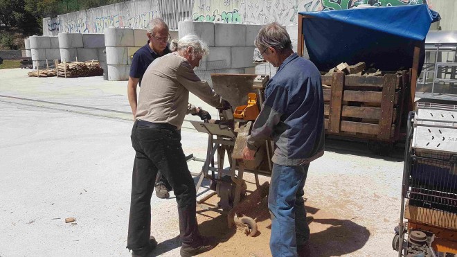 François rejoint l'équipe déjà constituée par MAD, Philippe et Pierre M. qui viennent de sortir la scie circulaire et s'attaquent au tas de bois déposé à notre intention derrière le dépôt.