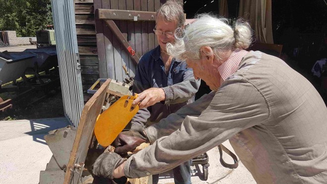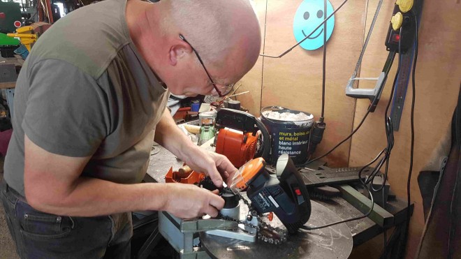 Jean-Pierre viendra participer au débitage du bois... lorsqu'il aura réussi à maîtriser ce tout nouvel appareil pour affûter la chaîne de la tronçonneuse...