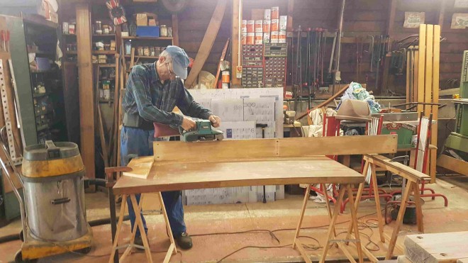 L'après-midi se terminera à l'abri de l'ombre de l'atelier pour Jean Paul au ponçage des bois de la baladeuse