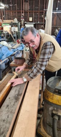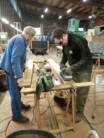 L'atelier bois continue le traitement des sièges et marchepieds de la baladeuse SOCOFER V-5 en cours de rénovation, Jean-Paul cumule aujourd'hui la direction et l'exécution...