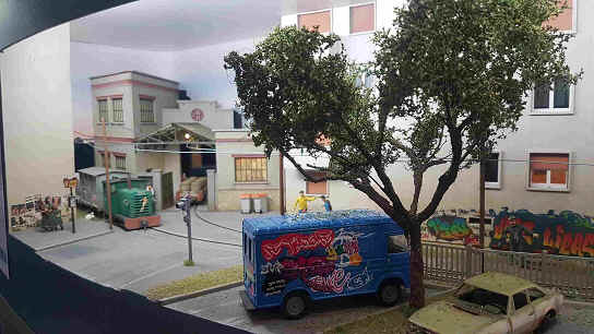 Le chemin de fer industriel a aussi inspiré quelques modélistes… ici dans une « zone » copieusement taguée à la « mode » contemporaine, ce petit train sortant de l’usine semble aussi
