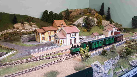 La voie de 60 est aussi représentée et malgré le nom de la localité indiqué sur le gare, « Le Petit Huit » et le « Café Tabac » aux consonances typiquement françaises, cette DFB et ses deux premières voitures à armatures apparentes a un look très germanique.