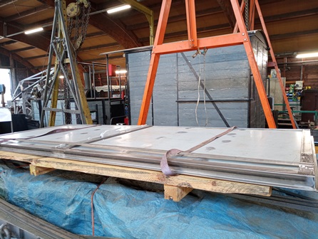 La porte de la remise du CFC Miniature est livrée. Elle sera installée dans la pairie des Fiancées sur le bâtiment construit par le département pour abriter le matériel roulant.