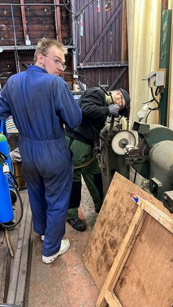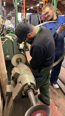 Chanteraine est en cours. Nicolas G. et Bruno F. en profitent pour redonner du « lustre » au cerclages laiton avec la nouvelle brosse à lustrer remontée par Michel G. sur le touret.