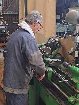 Pierre M. a entrepris de refaire la pince de serrage du tourne à gauche. Tournage dans l’acier Stub. Il a d’abord fait une trempe d’essai pour voir si l’acier prenait bien la trempe, puis un recuit pour permettre l’usinage.