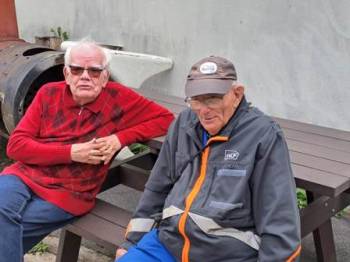 Jean-Paul B. et Michel L. poncent sans relâche les bois de nos baladeuses V3 et V6. Ici : un des rares moments de répit !