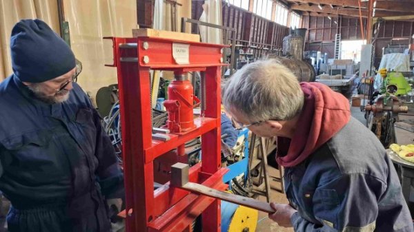 Pendant ce temps, Philippe D. et Pierre M. travaillent à la presse hydraulique à