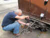 L’état des boites d’essieux du wagon DECAUVILLE nécessite un passage au gas-oil. C’est Alain qui tient le manche. |