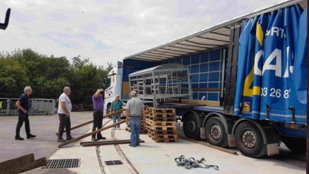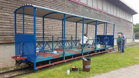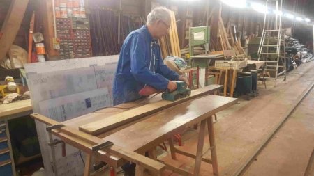 La rénovation de la baladeuse V-1 continue avec le ponçage et le traitement des parties en bois...