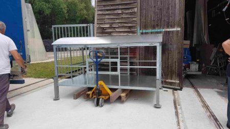 Aujourd'hui, déchargement de ces structures métalliques pas du tout ferroviaires... il s'agit de poulaillers destinés à la